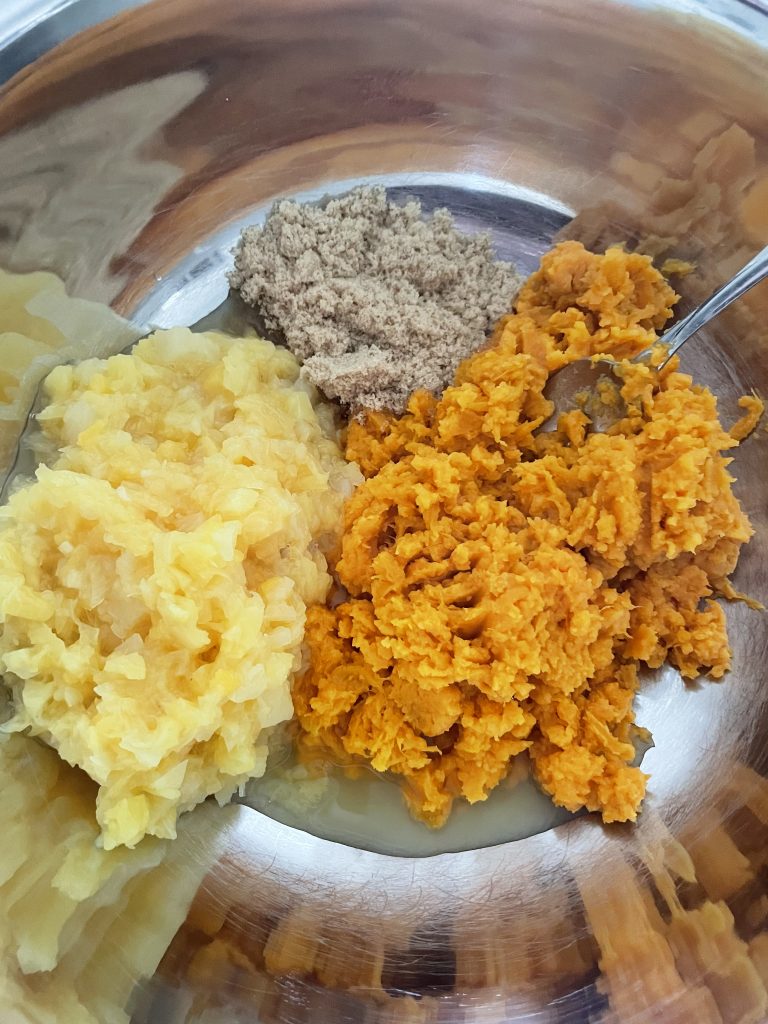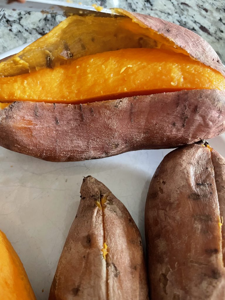 To roast your sweet potatoes, wrap them in foil and put them in a pre-heated 400F oven for 45 minutes to an hour. POKE YOUR POTATOES. Use a fork. If you don’t there is a possibility that the potatoes will explode. Ask me how I know. They should squish when you grab them when they are done. Cut a slit down the middle and the outer skin should literally just peel off.