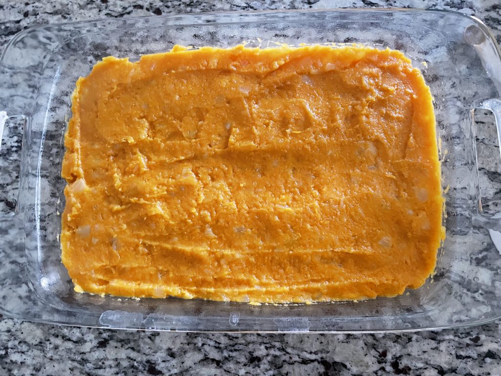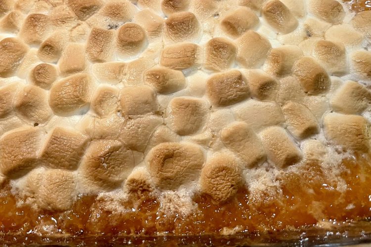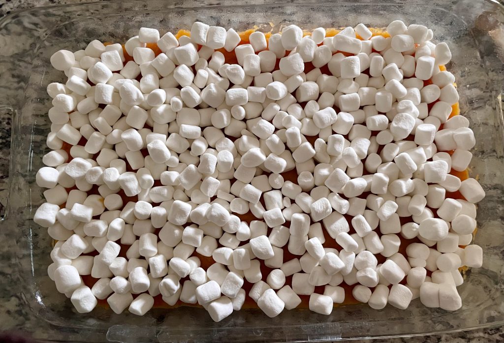 • Butter a casserole dish. Mix all the ingredients together (excluding the marshmallows). Spoon into the prepped casserole dish and then top with the mini marshmallows.