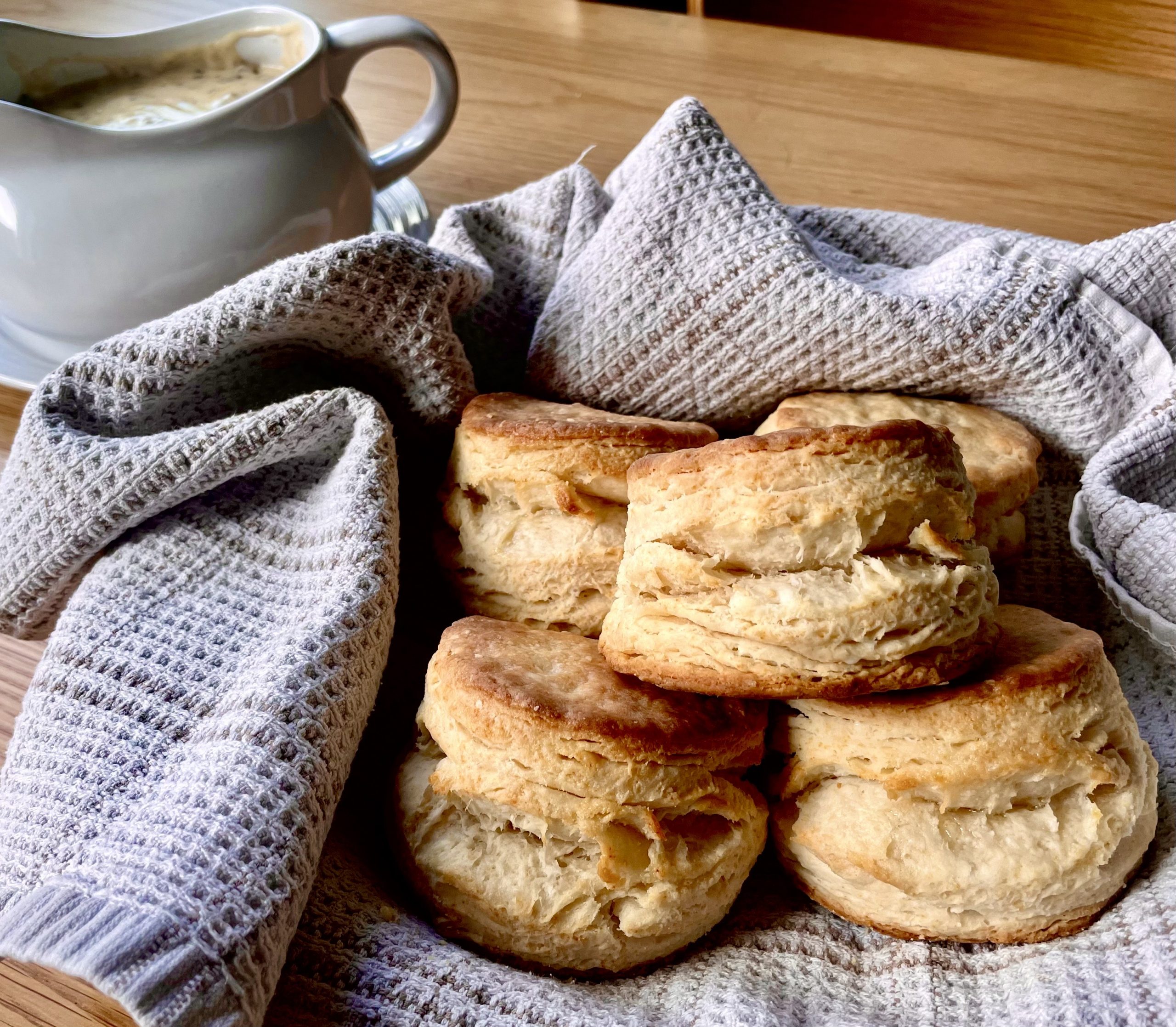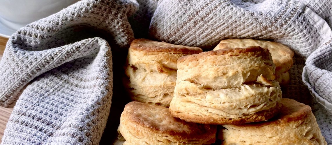 Since I really love cooking and creating recipes, I have been trying to perfect the humble but glorious buttermilk biscuit for several years. I have tried so many biscuit recipes, taking bits that work here and there, finally managing to create these perfectly fluffy and sky-high buttermilk biscuits that are perfect hot with jam and butter, making breakfast sandwiches, and biscuits and gravy. I’ll admit that when these bad boys came out with flaky layers like those biscuits from a can that we all know and love *wink wink* I was ecstatic! I’m sure I looked silly just squatting in front of my oven window watching my biscuits get higher and higher, but omg I was so excited to see how high they were getting!