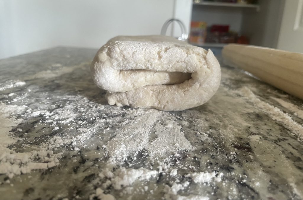 - Generously flour a cutting board or a clean kitchen counter and your rolling pin. Make a large ball with your dough and then roll it out to about 1/2-3/4 inch thick. In order to get buttery layers, the dough will need to be folded. To do this, fold the dough like if you were folding a letter to put it into an envelope. Flip dough over and once again roll it out to 1/2-3/4 inches thick and fold the same way. Do it a third time, but this time roll the dough out to no thinner than 3/4 inch thick. Use your biscuit cutter or large cup. If you have extra dough, you can repeat the process. This should yield 5-6 biscuits.